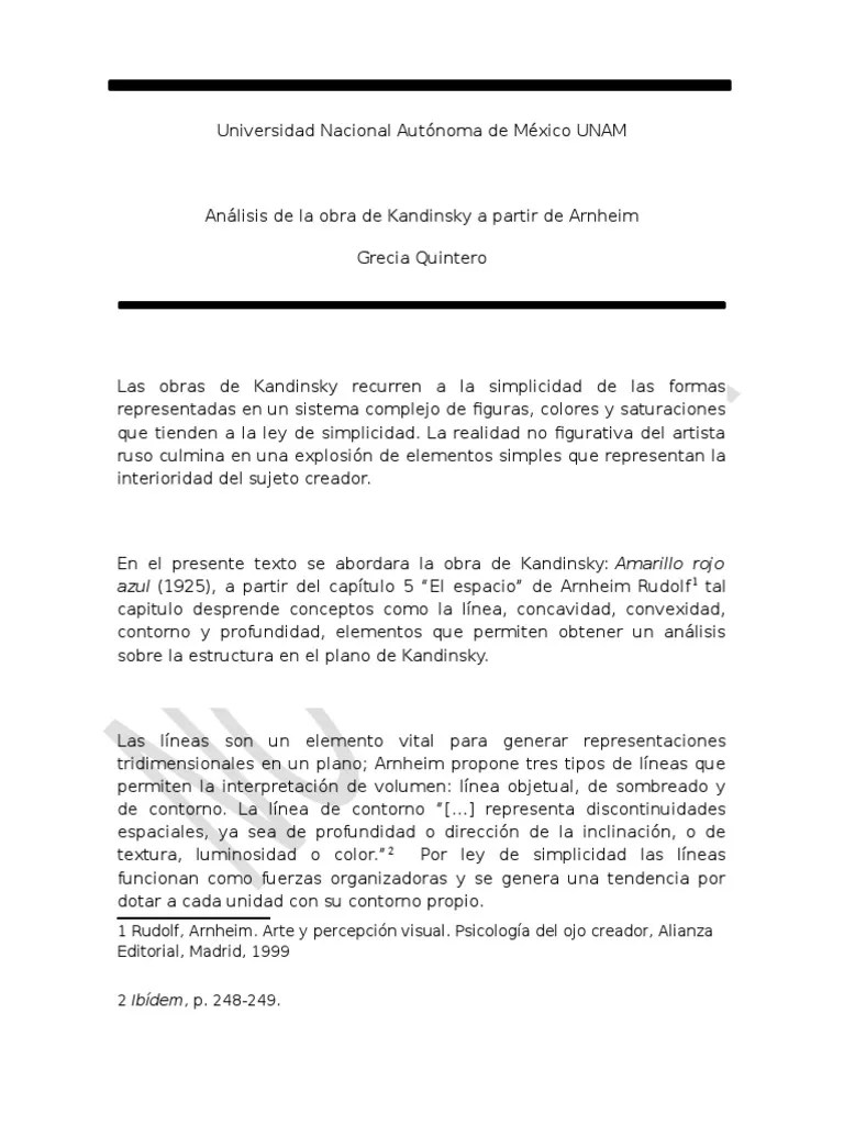 La característica principal de esta obra es la unión de formas regulares como círculos, rectángulos y triángulos con formas libres y gestuales como la serpenteante línea negra. Amarillo rojo azul (1925), a partir del capítulo 5 "el espacio" de arnheim rudolf 1 tal capitulo desprende conceptos como la línea, concavidad, convexidad, contorno y profundidad, elementos que permiten obtener un análisis sobre la estructura en el plano de kandinsky. Es una pintura al óleo sobre lienzo. En el presente texto se abordara la obra de kandinsky: Amarillo, rojo y azul fecha. Amarillo, rojo y azul (kandinsky) esta pintura pertenece a kandinsky, del año 1925, y pertenece al movimiento de arte abstracto... Capitulo desprende conceptos como la lnea, concavidad, convexidad, contorno y profundidad, elementos que permiten obtener …
